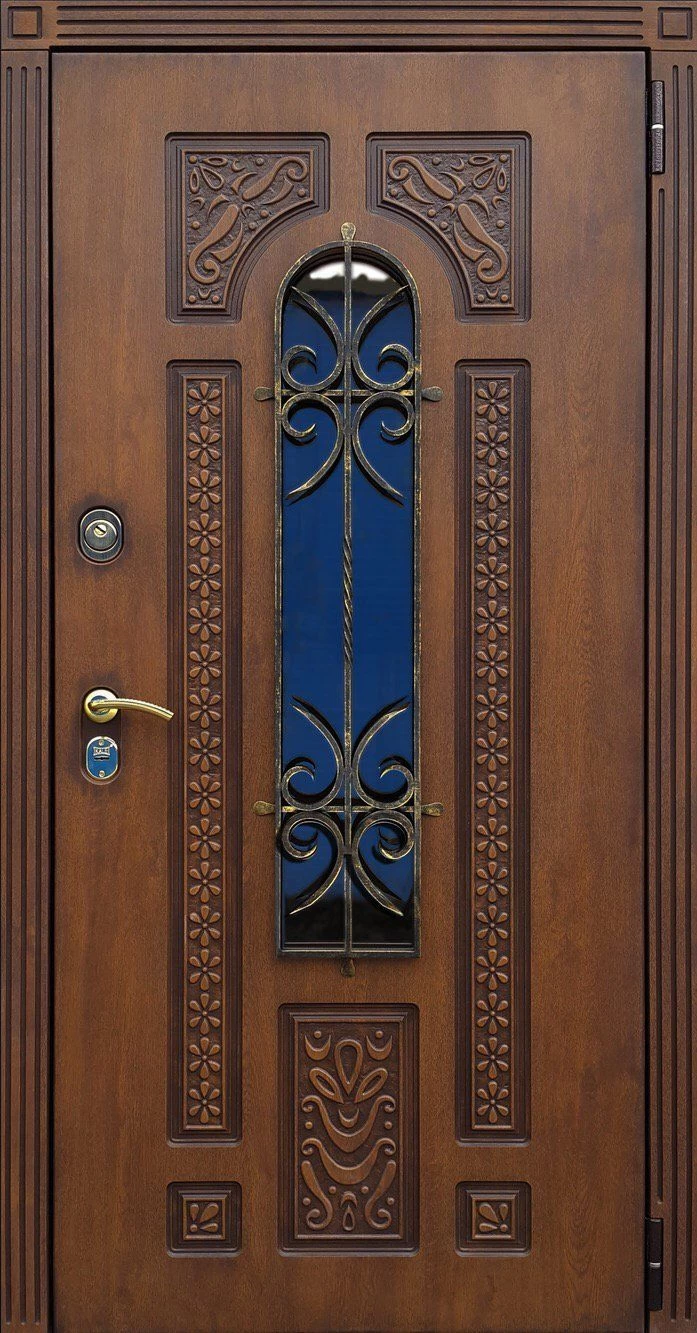 Входные двери в Касли с применением декора витражом изготавливаются из стального профиля, придающего прочность конструкции, а сама витражная вставка обладает высокой взломостойкостью, поскольку для витражных композиций используется специальное стекло, обработанное особым образом. Усилить надежность витражного элемента можно с помощью использования декоративных кованных решеток.